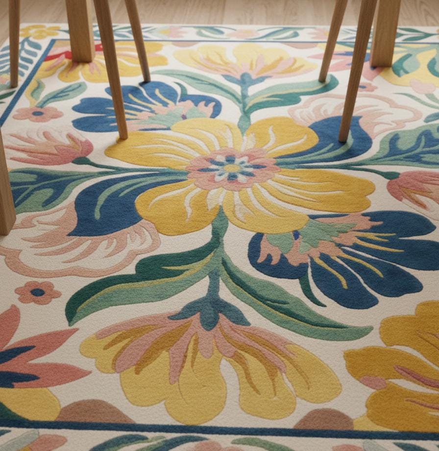 Design Aesthetic: The oversized blooms in mustard, teal, and rose pink offer a "Grandmillennial" or "Cottagecore" charm that anchors a room without overwhelming it.