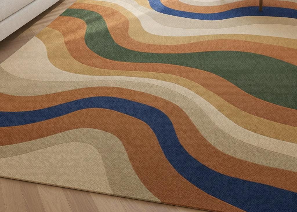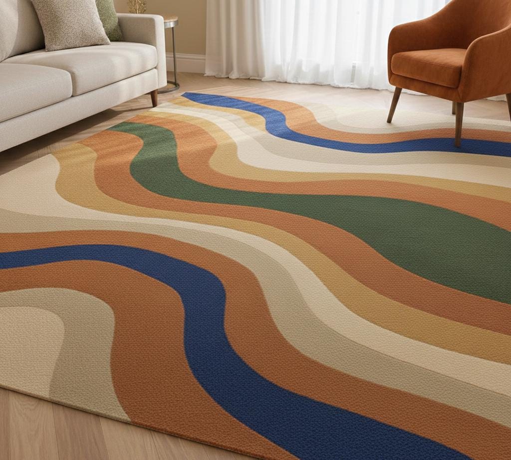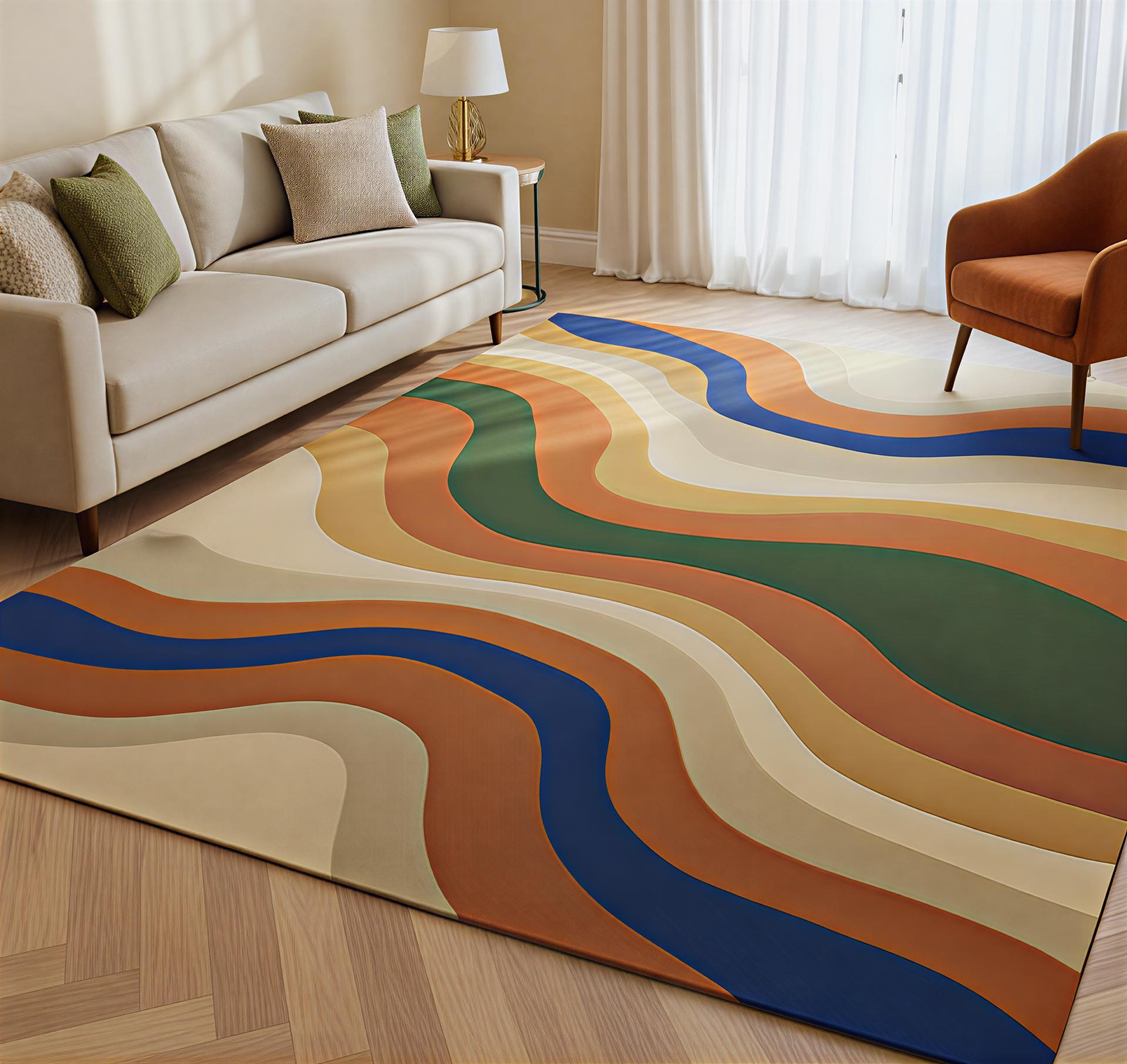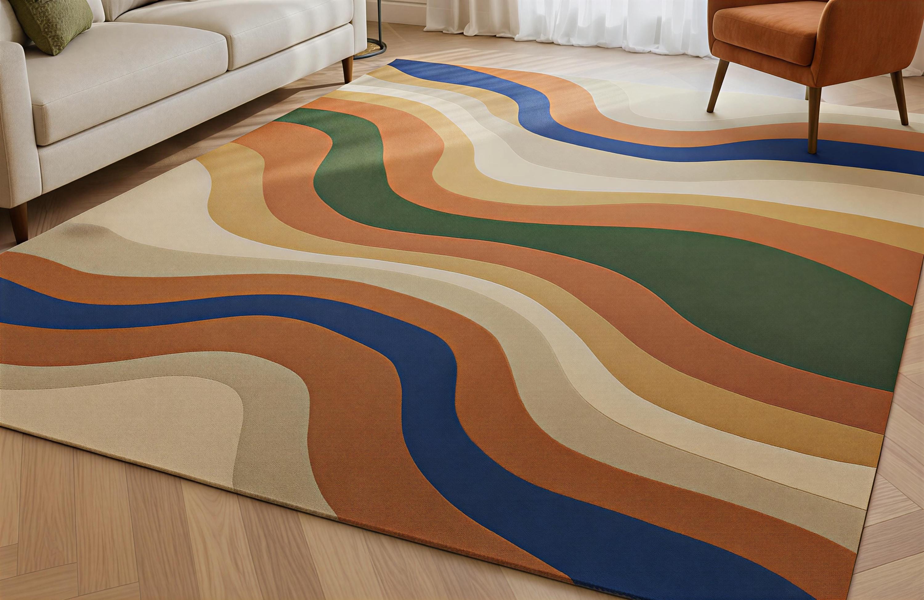 Bring a touch of artisan luxury to your floors with this Hand-Tufted Wavy Wool Rug. Designed for those who love the bold energy of Mid-Century Modern decor, this retro area rug features a striking organic pattern that mimics flowing waves. The earthy palette of terracotta, forest green, and cobalt blue is expertly woven into the premium wool fibers, creating a high-quality statement piece that anchors any room with 70s-inspired charm.