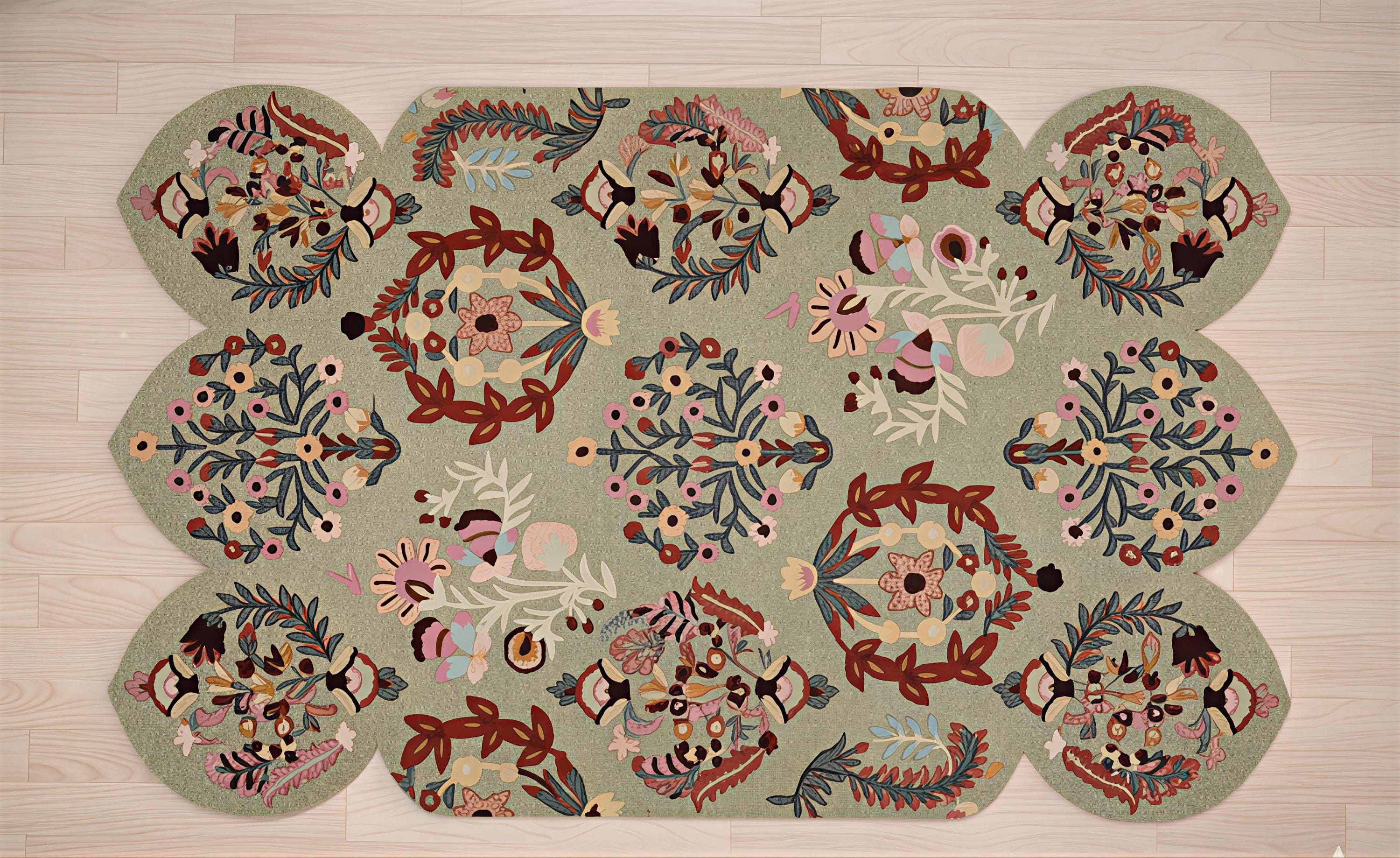 Elevate your home with this exquisite hand tufted wool scalloped floral rug, where traditional craftsmanship meets whimsical organic design. Featuring a unique wavy border and intricate botanical folk-art motifs, this premium floor covering adds a sophisticated yet cozy touch to any nursery, bedroom, or living space.
