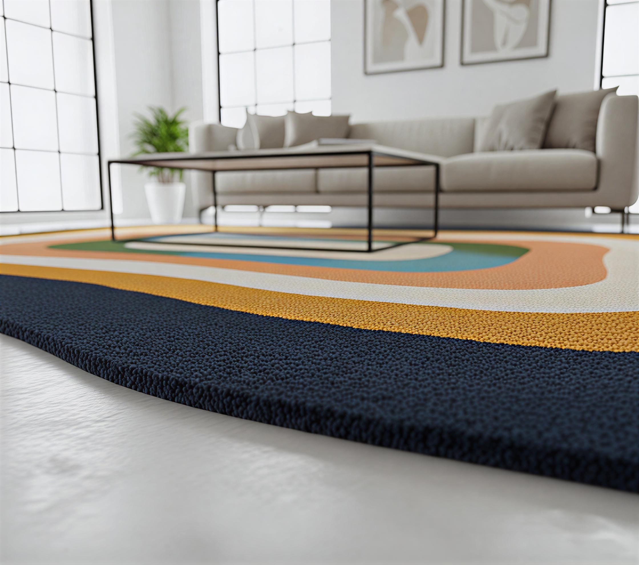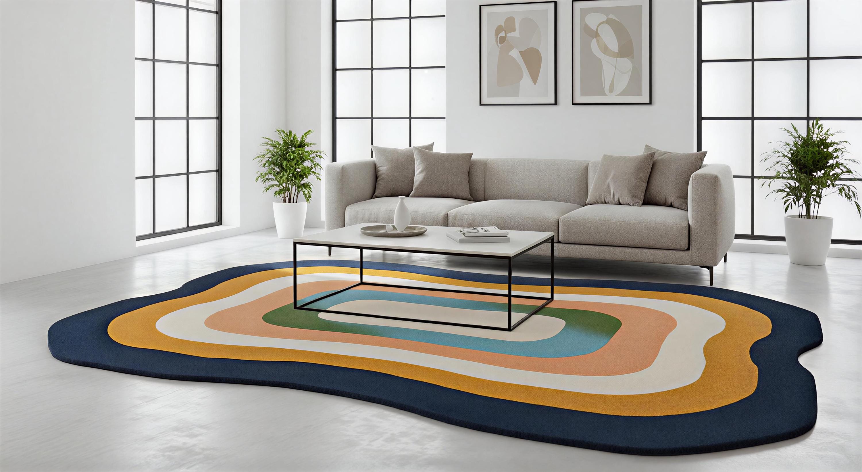 Designed with a playful wavy irregular shape, this colorful area rug features a retro-inspired palette that brings a bold, modern abstract energy to any room. Handcrafted from natural fibers, the plush navy blue wool and warm earth tones create a high-quality, aesthetic room decor statement that feels as luxurious as it looks.