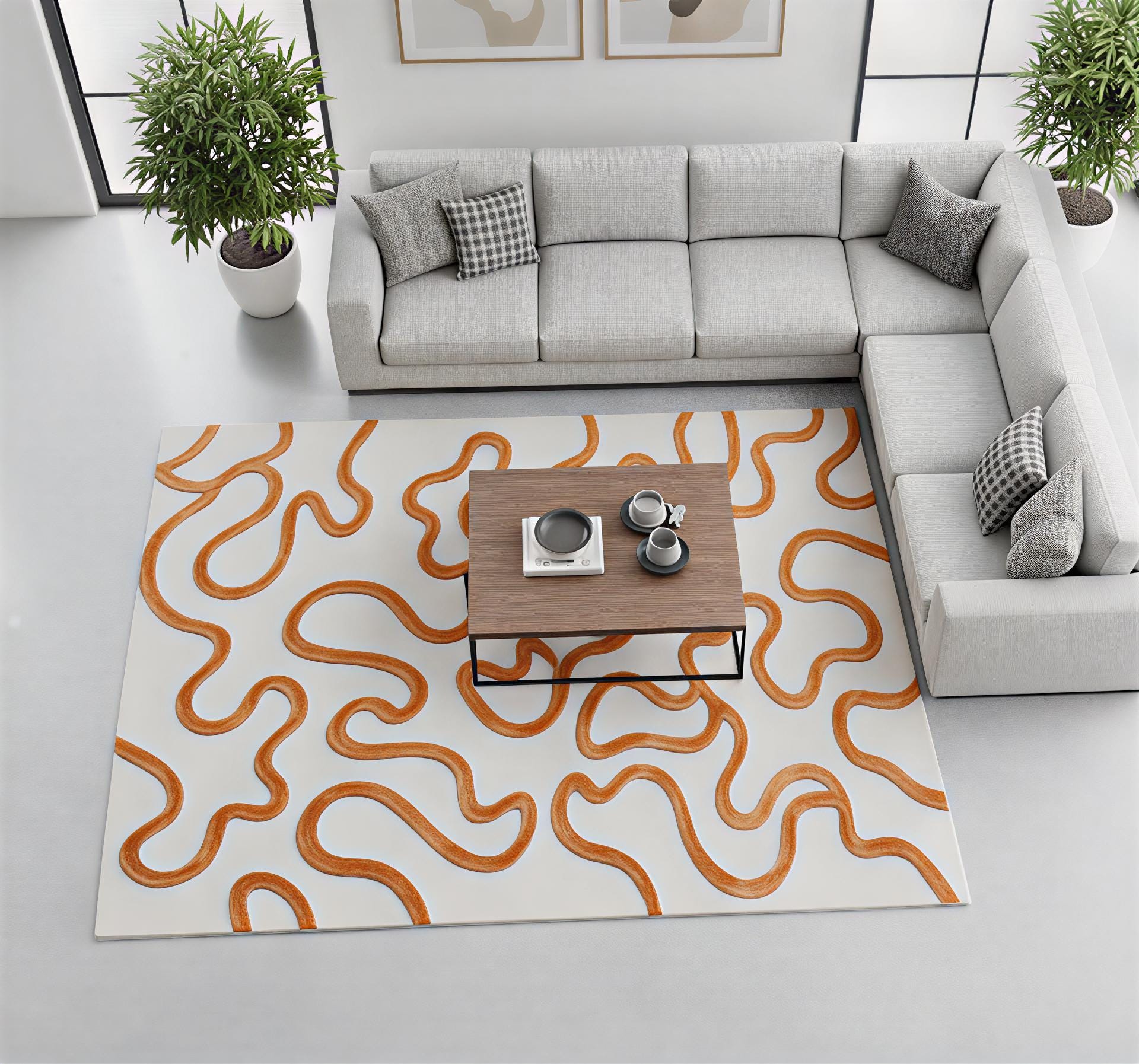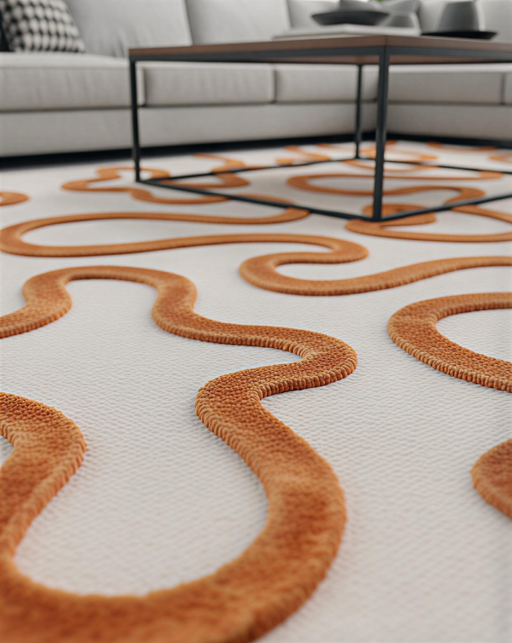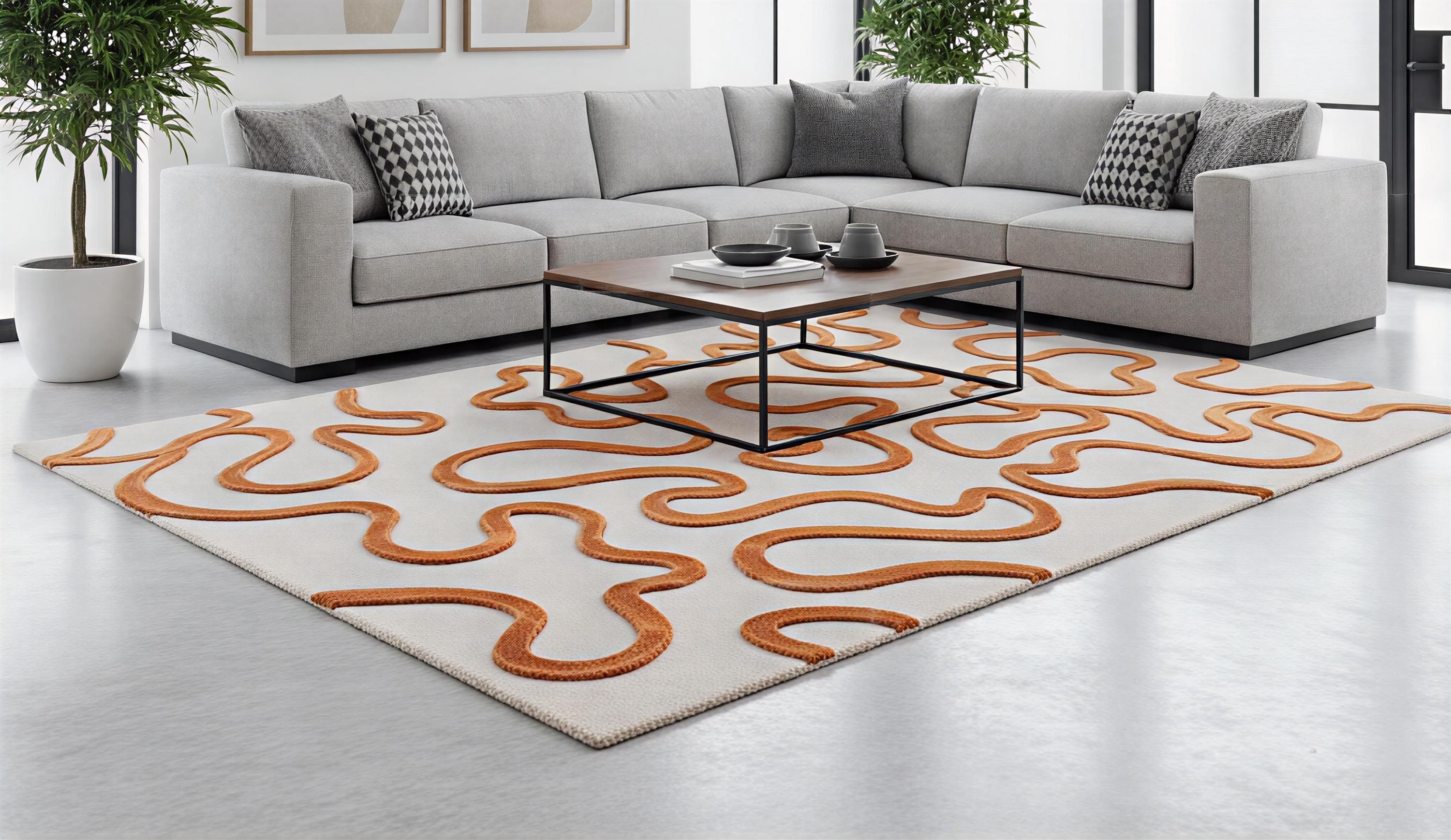 Transform your home with our 3D wiggle wool rug, a statement piece that combines modern art with traditional craftsmanship. This hand-tufted terracotta and cream rug features a unique sculptural area rug design, where the "wavy" patterns are hand-carved to create a stunning high-low texture. Whether you are looking for a minimalist wool carpet for your living room or a bold mid-century modern accent, this rug adds immediate depth and warmth to any space.