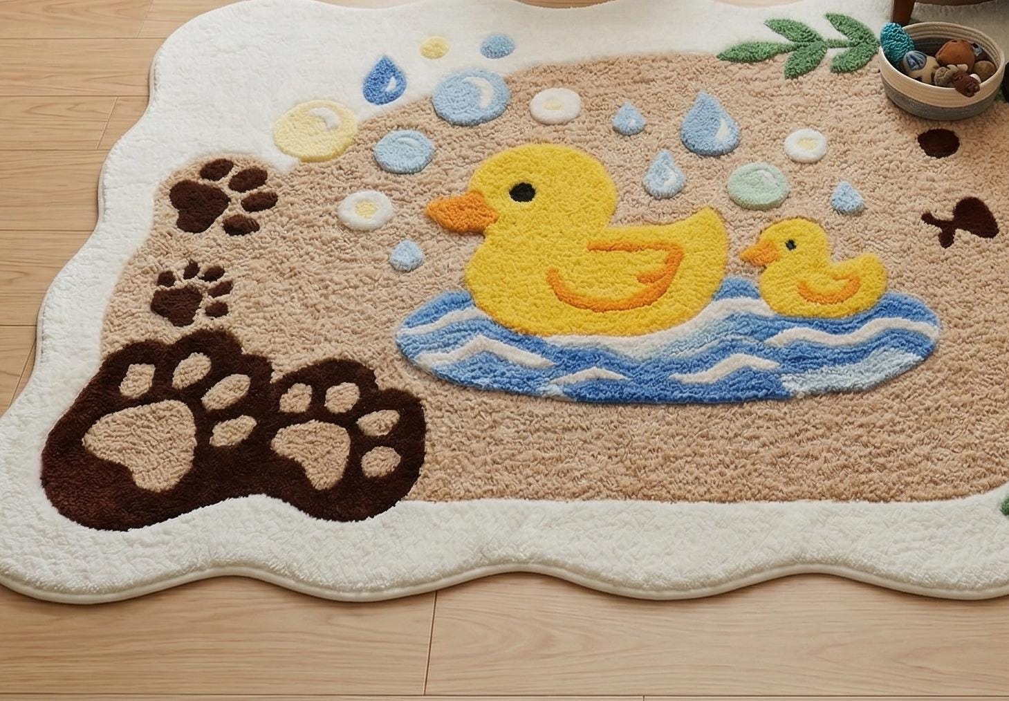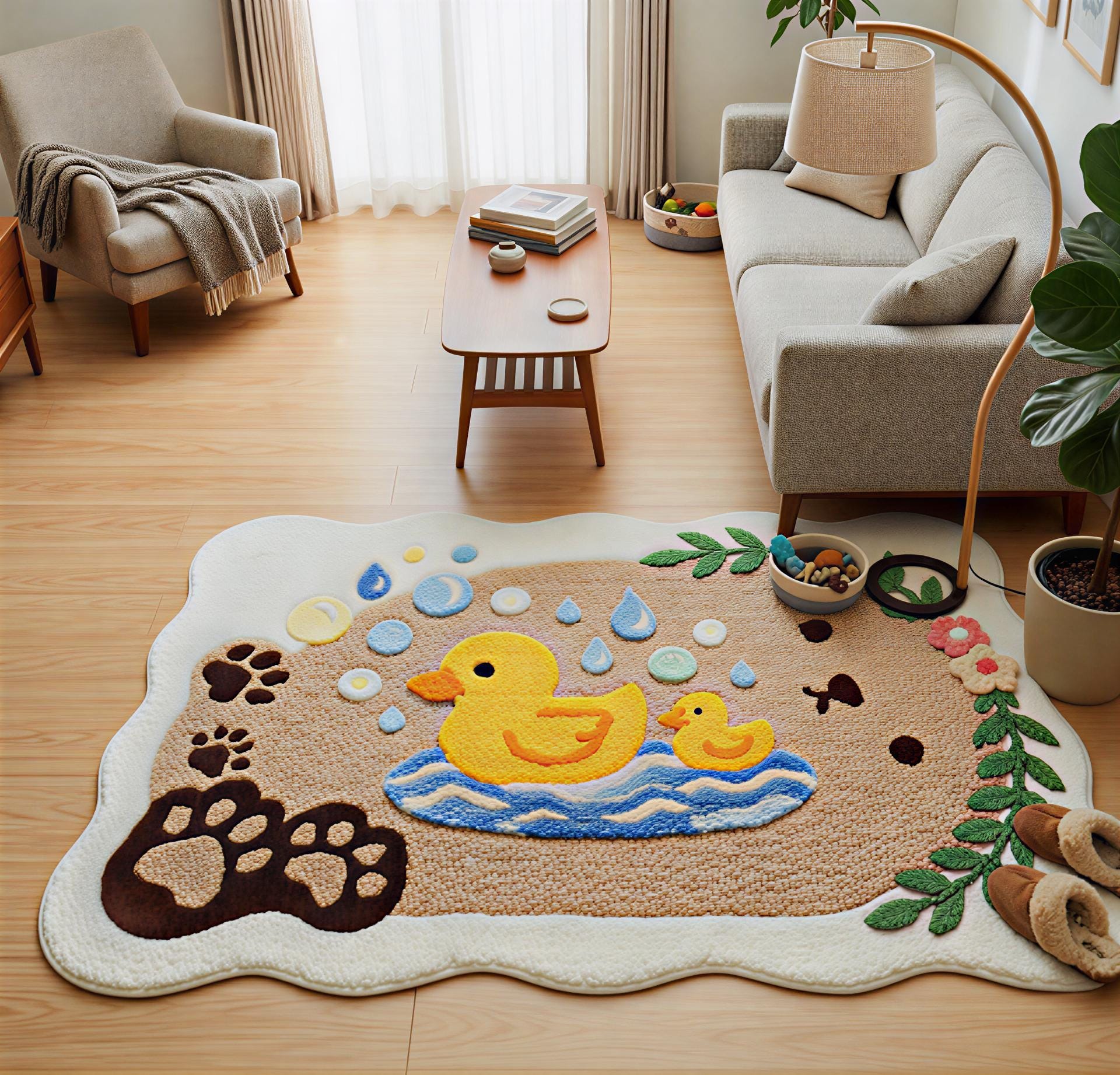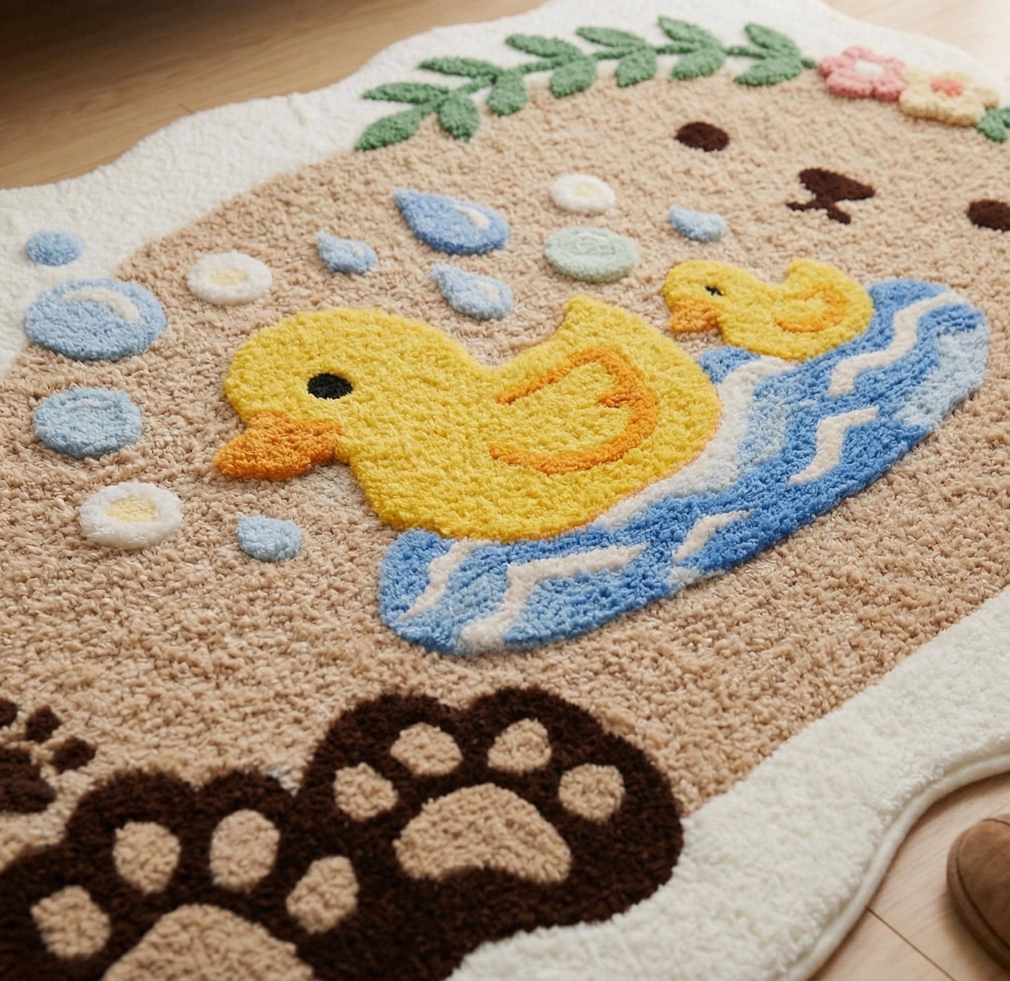 Transform Your Space with This Hand-Tufted Duck Wool Rug ✨ Experience the ultimate blend of whimsy and luxury with our Hand-Tufted Duck Rug. Crafted from 100% premium wool, this thick, plush oval rug features a charming scene of yellow ducks, bubbly water, and playful paw prints. It’s the perfect aesthetic nursery decor or a unique statement piece for a cottagecore bedroom.
