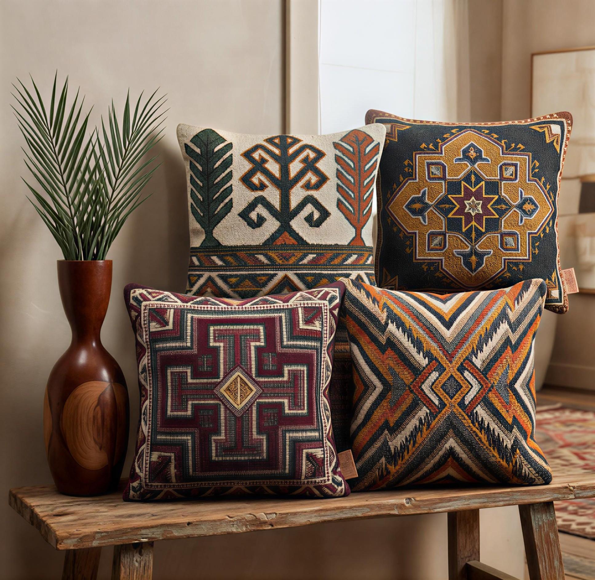 Introducing a meticulously curated collection of four unique, premium cushion covers that blend the rustic authenticity of traditional Indian weaving with sophisticated, high-texture design. This is not just a pillow set; it’s a statement of artisanal craft for your living space.