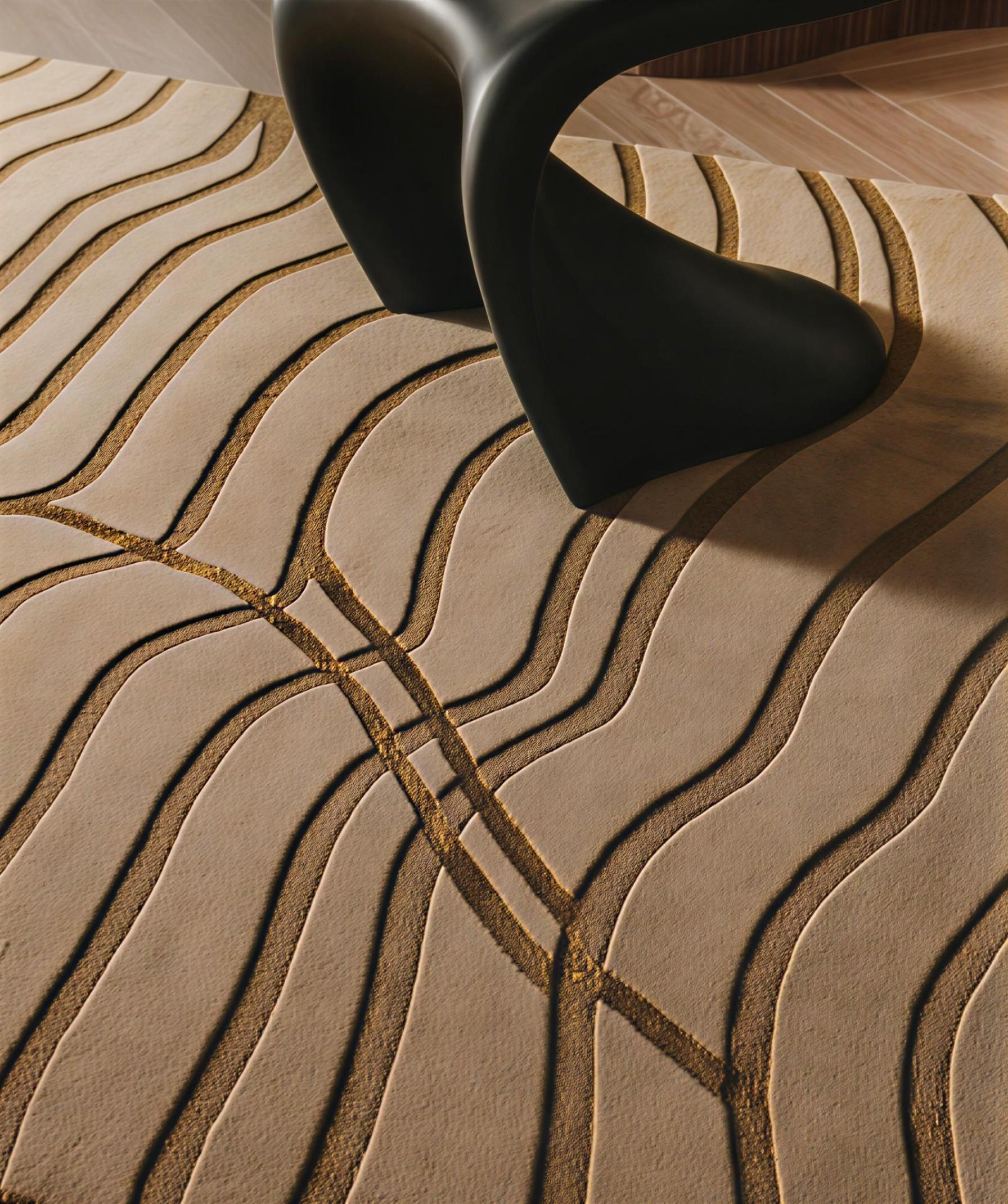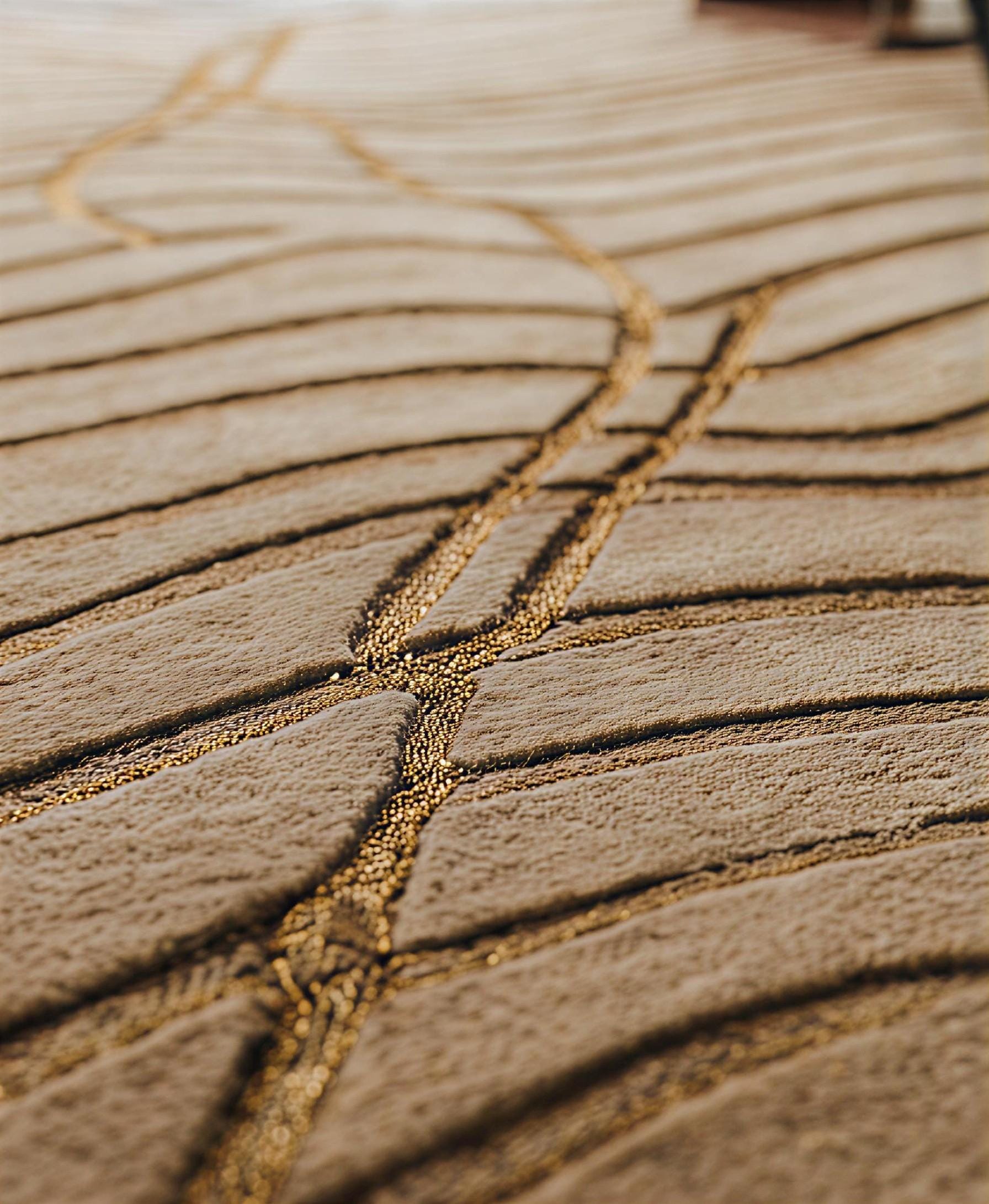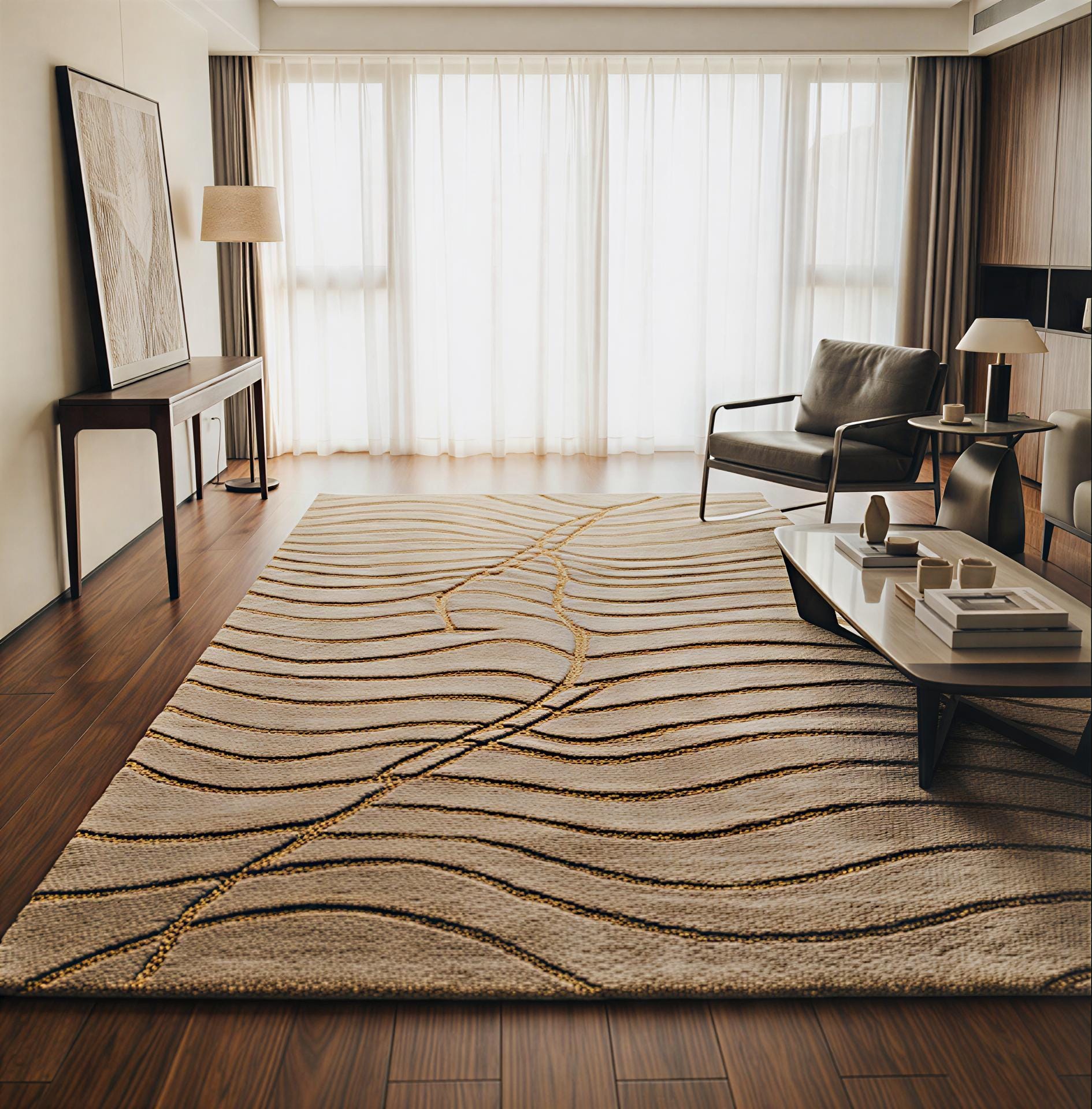 Designed for the modern minimalist, this rug features a striking organic pattern inspired by natural elements—think winding riverbeds or the delicate veins of a leaf. The sophisticated palette of warm beige and shimmering gold accents creates a serene yet commanding focal point for any room.