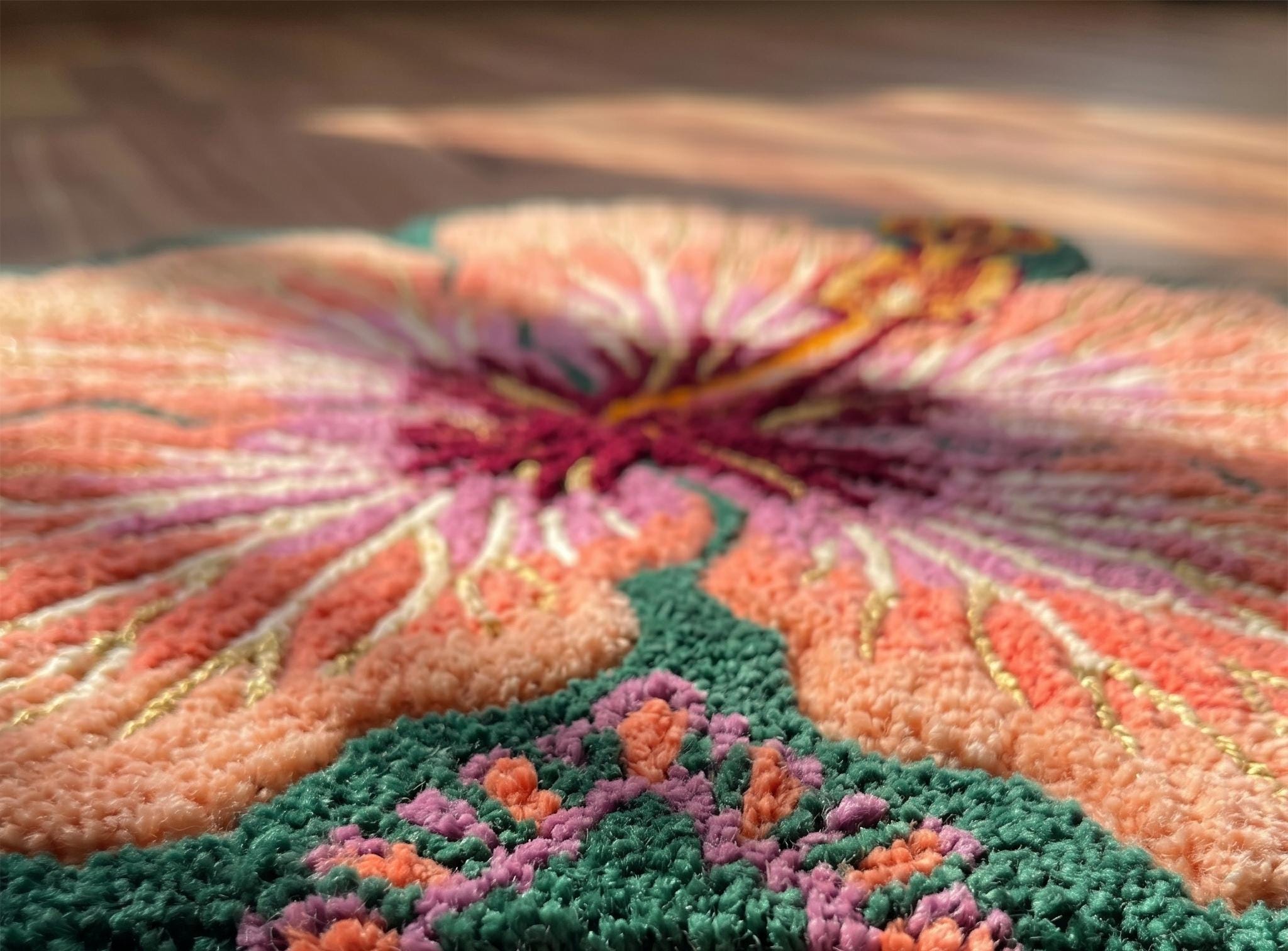 🧶 Materials & Craftsmanship The Process: Yarns are hand-punched into a canvas and secured with a clean, anti-slip cotton backing for a professional finish.
